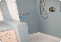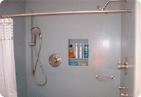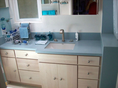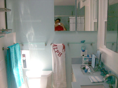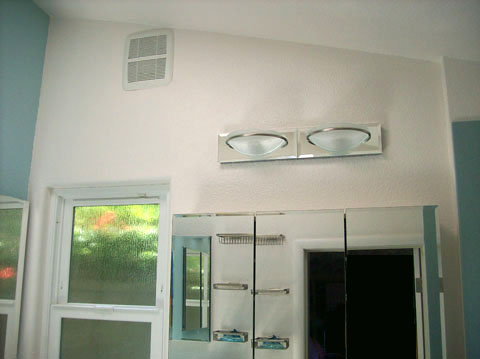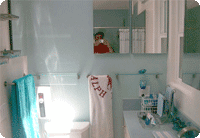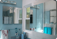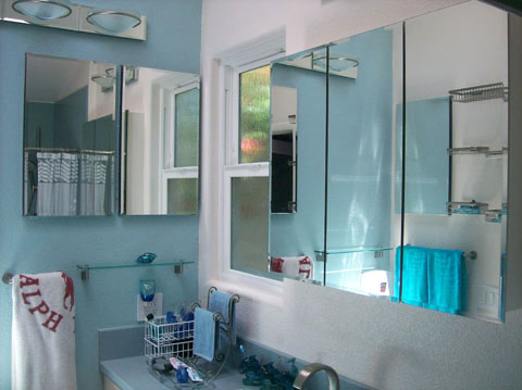Mirror cabinets and glass shelves for a beautiful bathroom. You would never know that this room had water and mold damage.