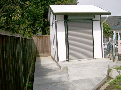 - This has a roll up door and a concrete landing and walkway.