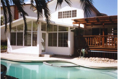 - This is a towering gable roof patio enclosure with large upper transom windows, grided sliding windows, full fiew grided swing door.