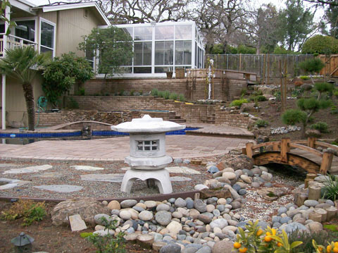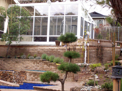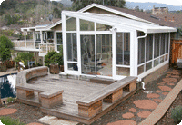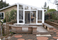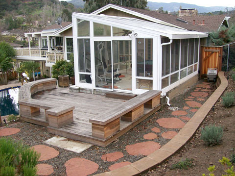 Trapezoid transom windows above the sliding door that leads out to the wood deck.